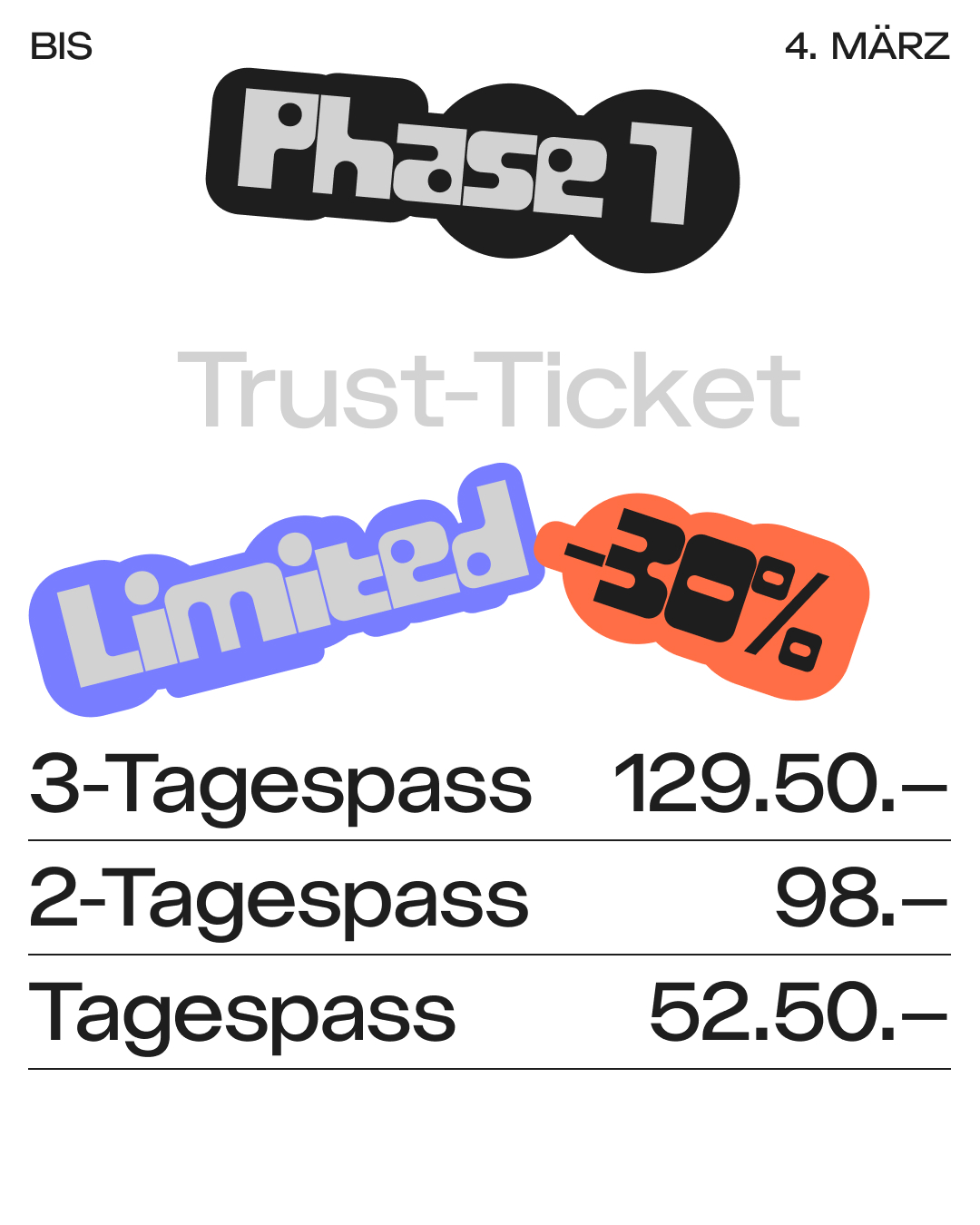 Die letzten Jahre waren für viele kleine und mittelgrosse Festivals finanziell sehr herausfordernd, auch für das B-Sides. Mit dem Kauf eines Tickets zum Soli-Tarif (+10 CHF) ermöglichst du uns eine erfolgreiche Weiterentwicklung und hilfst mit, dass das B-Sides ein diverses, inklusives, mutiges und aussergewöhnliches Festival bleibt. Vielen Dank!